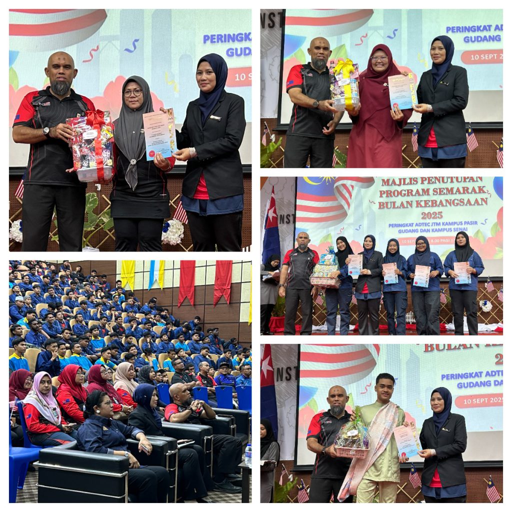 Pasir Gudang, 10 September 2025 – Majlis Penutupan Program Semarak Bulan Kebangsaan 2025 Peringkat ADTEC JTM Kampus Pasir Gudang & Kampus Senai telah berlangsung dengan penuh meriah di Dewan Kuliah Utama, Kampus Pasir Gudang serta di Dewan Sri Johor, Kampus Senai.